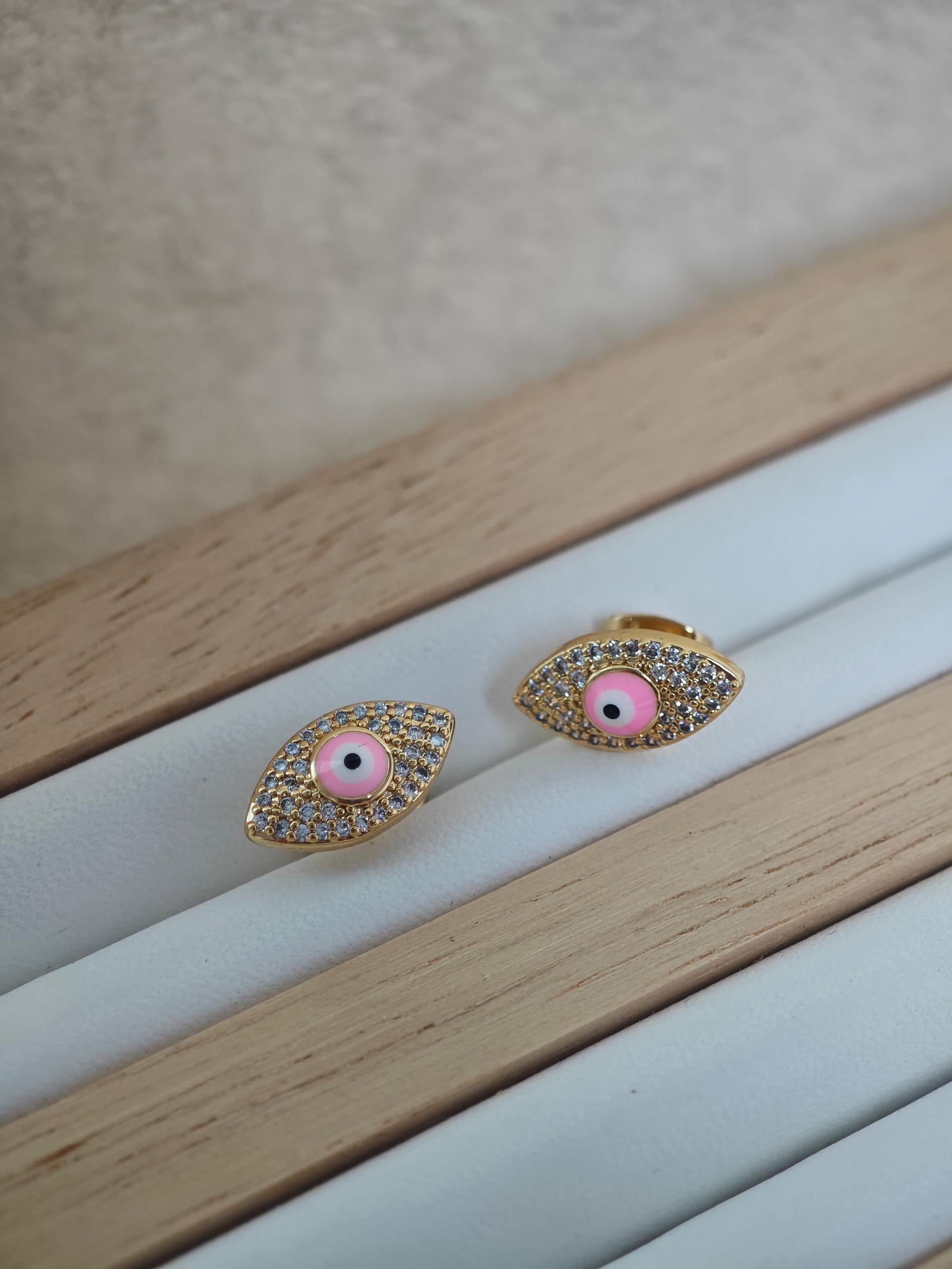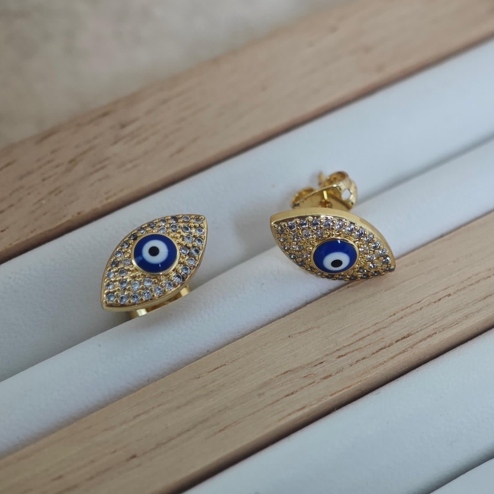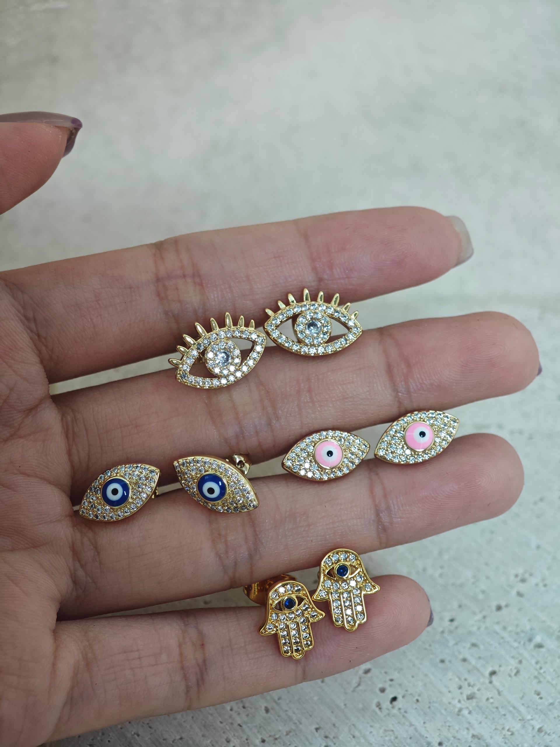Estos aretes pegados en acero inoxidable cuentan con un ojo turco full brillo y esmalte en el centro para protección. Con mariposa en la parte trasera para mayor seguridad. Añade un toque de estilo y protección a tu look.